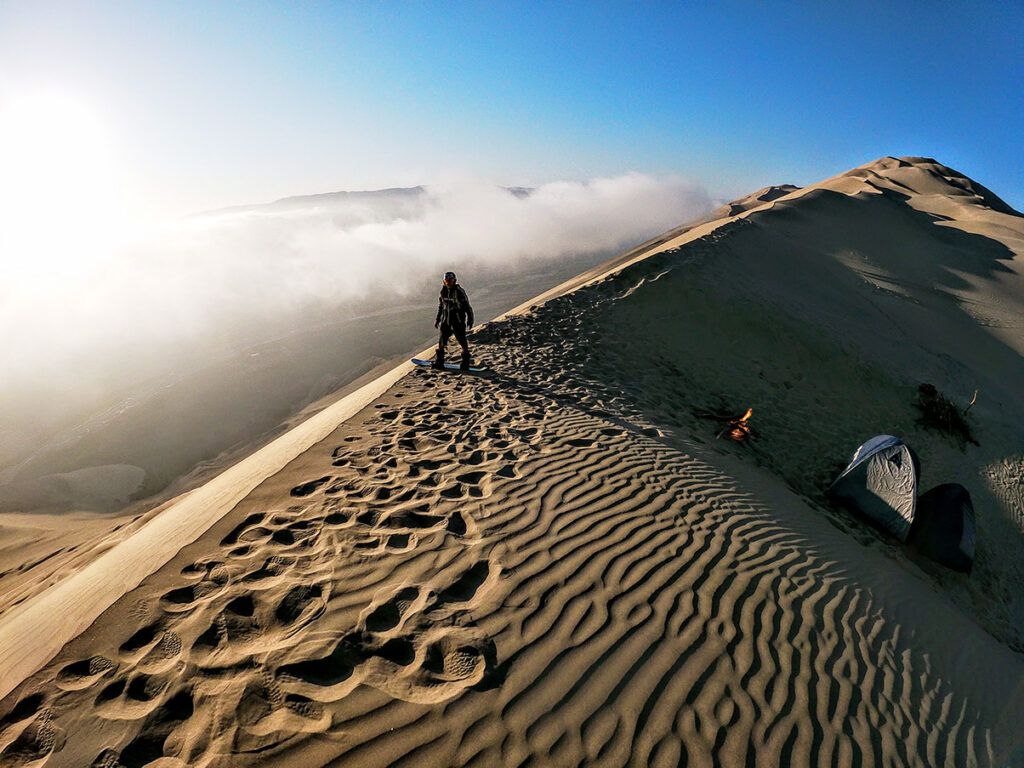 - We had discovered the easiest way to climb the dune, still not easy, approximately 4 hours of hiking, 10 kilometers and 1.3k of altitude from the bottom to the top carrying your board.